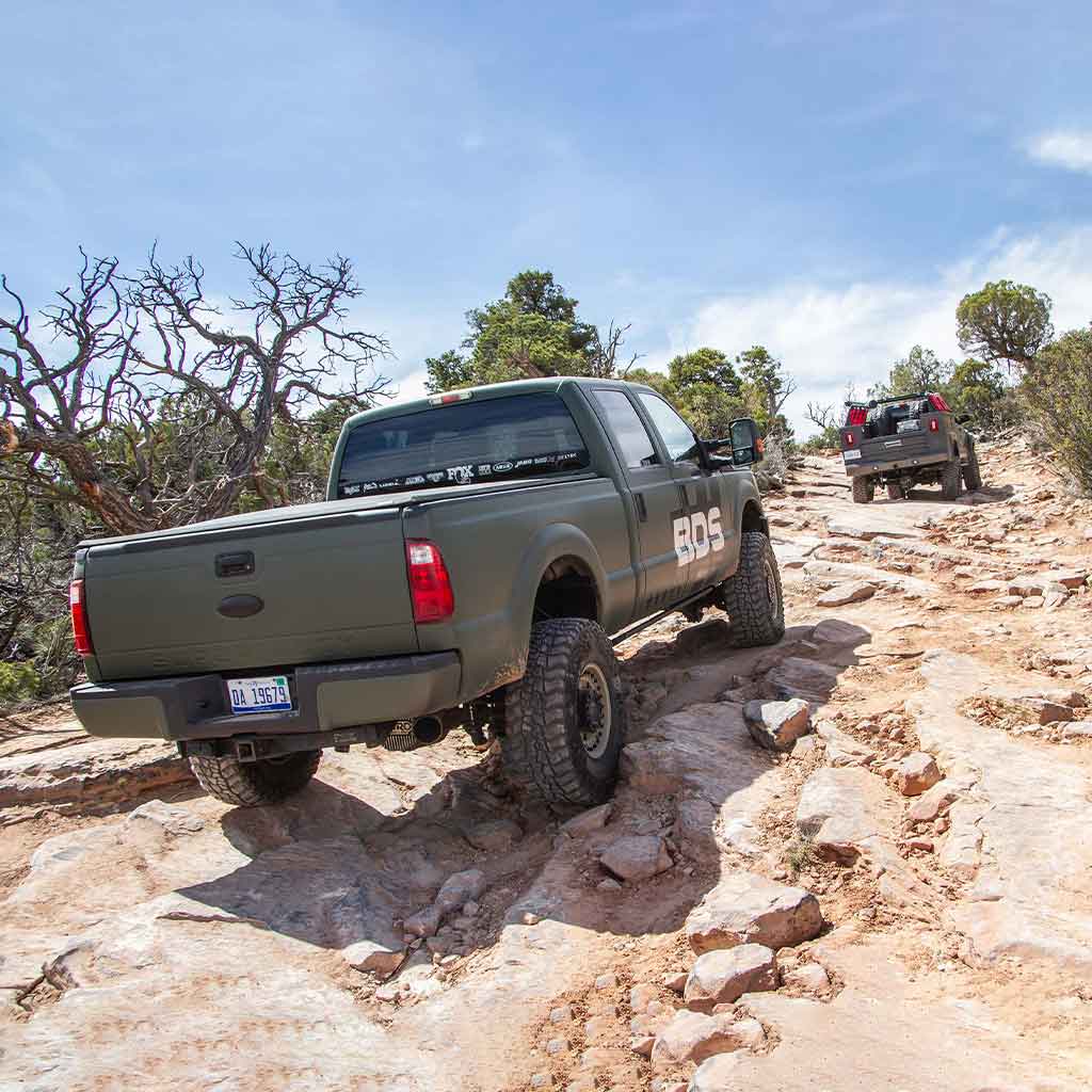 The additional height comes from a pair of full length ProRide coil springs. These springs are a direct bolt-in replacement, designed with the spring rate specific to the weight of either the diesel or gas engine while providing 4" of lift. These paired with your choice of BDS NX2 series gas shocks or the precision tuned FOX 2.0 performance gas shocks offer a smooth ride and improved control over rough terrain. To improve steering angles a forged drop pitman arm is supplied with an integrated drag link flip. Used in combination with the 1/4" thick heavy duty track bar drop bracket will position the front axle and keep the track bar angle in phase with the steering for improved handling. Also included for the front suspension are a pair of sway bar relocation brackets, bump stop extensions, brake line relocation brackets and a steering stabilizer mounting bracket.