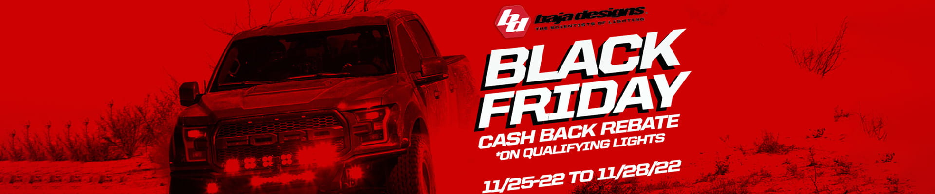 Baja Designs are offering cash back on select Baja Designs lights, putting money back into your pocket this season. Offer available to retail customers only and orders placed between 11-25-2022 to 11-28-2022. Complete and return the mail-in rebate card with a copy of your receipt/invoice within 30 days of the order date to claim your cash rebate from Baja Designs. If you have any questions, you can reach out to rebates@bajadesigns.com