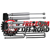 Forged lift torsion keys adjustable for 1-3" of front lift Carbon steel 3" rear lift blocks with extended U-bolts High pressure nitrogen charged shocks