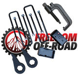 Forged lift torsion keys adjustable for 1-3" of front lift Carbon steel 3" rear lift blocks with extended U-bolts Forged torsion key installation tool