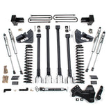 These systems upgrade the factory stamped steel radius arms to a high strength 4-link offering improved handling, stability, strength and caster control during wheel travel. The 4-link brackets are built from 1/4" steel and key off the factory frame bracket and transmission crossmember for extra strength. Full length 4" ProRide diesel or gas specific coil springs are used for the additional ride height paired with your choice of BDS NX2 series gas shocks or FOX 2.0 IFP performance gas shocks for a smooth ride on any terrain. A forged drop pitman arm and heavy duty track bar relocation bracket are supplied to correct steering angles and recenter the front axle. Also supplied for the front are bump stop extensions to limit suspension compression, sway bar drop brackets to correct the sway bar positioning, and brake line relocation brackets. In the rear of these 4" systems BDS offers the your choice of replacement rear lift blocks or replacement GlideRide leaf springs. Either option will level out the stance, the spring replacement has the added benefits of an integrated overload leaf for additional load capacity. Additionally high strength black e-coated u-bolts are supplied along with a pair of matching NX2 or FOX 2.0 gas shocks to compliment the front setup for all around impressive performance. Take your Super Duty to the next level with BDS Suspension.