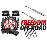 Carbon steel lift spacers with grade 8 hardware provide 3" of lift 2" lift tapered steel blocks reduce driveshaft angle Fabricated carbon steel rear blocks with black powder coated finish Extended U-bolts with black zinc coating and grade 8 hardware High-pressure nitrogen charged rear lift shocks