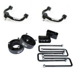 Pair of control arms designed to correct ball joint angle on vehicles lifted 2-4" while maintaining factory alignment specs 1.5" tubing with provisions for brake/ABS lines (where applicable) and gussets for increased strength Heavy duty OEM style ball joints and hardened rubber bushings reduce deflection with minimal maintenance Front billet aluminum lift spacers with grade 8 hardware provide 3" of lift Rear 2" blocks with extended U-bolts