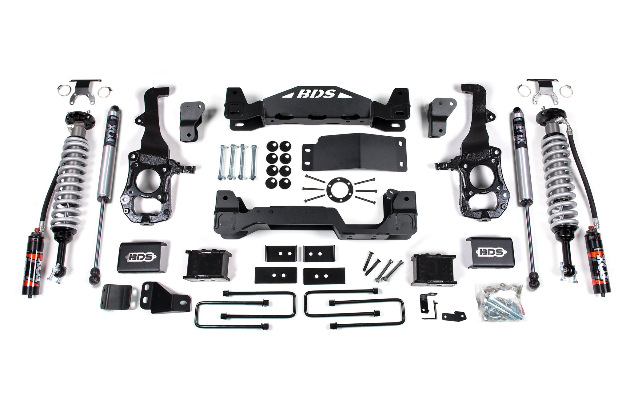 Maximize the performance and capability of the 2021-2024 Ford F150 trucks with 6-inch coil-over suspension lift kits. These kits feature proprietary FOX Performance Elite 2.5 coil-over shocks designed specifically to bolt-on performance for increase travel and the ability to soak up the roughest terrain along with smooth on-road comfort. This kit includes everything necessary to set your F150 truck up right with clearance for up to 37" tires.